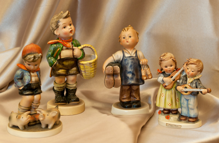 Festett porcelán; Kondás fiú, 15cm, 52.000Ft; Kosaras fiú, 18cm, 69.000Ft; Csizmadia, 15cm, 52.000Ft; Fiú-lány zenészpáros, 12cm, 59.000Ft